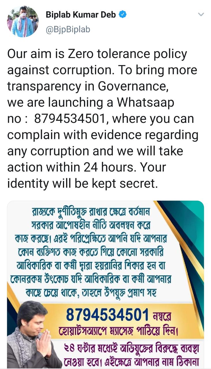 AGARTALA, May 05 2020: Tripura Chief Minister Biplab Kumar Deb has warned against any sort of corruption in government establishments. He appealed people to come forward to lodge complaint against the menace.